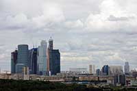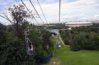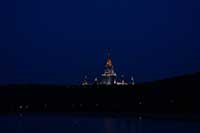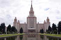 12h23 Départ pour le Mont des moineaux et l'université. Le parc boisé est fort agréable mais l'on remarque vite les camera 360° tous les 50m : incroyable. Arrivés au sommet on a une vue dégagée sur Moscou et ses environs. On découvre le tremplin de saut à ski et le télésiège (et non un téléphérique : encore ce guide pourri) en fonctionnement, quelques marchands ambulants et surtout l'incroyable université. Une ville dans la ville.