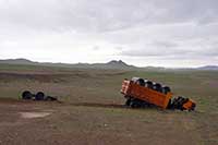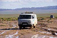 Deux petits vans typiques d'ici (genre WW mini bus, gris, 4x4, surélevés qui sont de fabrication russe) arrivent vers nous en sens inverse, donc par la sortie du champ de boue pour nous. Le premier véhicule se lance, fait des travers pas possibles mais toujours maitrisés par le chauffeur mongol. Il passe sans trop de problème et s'arrête à coté de nous pour regarder le deuxième qui se lance à son tour.