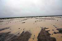 La route jaune sur la carte est infernale 7km/h. Zone de marécage à traverser. On ne voit que deux bandes parallèles d'eau séparée par une bande de terre. Mais on passe lentement, avec quelques angoisses. Christian s'agrippe à la poignée et comme on dit chez nous 'serre les fesses'. Il évite de penser aux conséquences si on restait bloqués.