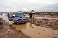 Une plaque se coince entre les lames d'amortisseur et le pneu de notre 4x4. On craint pour la survie du pneu. Il faut lever la voiture avec le cric pour dégager la plaque. L'eau monte et commence à ruisseler. Finalement après une dernière tentative Michel patine sur les plaques en tirant Jeannot qui lui reste définitivement scotché, au sens propre du terme, en travers des ornières. L’arrière est presque sortie d’affaire, mais la voiture repose sur le pont avant. La flotte arrive au marchepied et j'ai de l'eau juste en dessous du genou au fond des ornières.